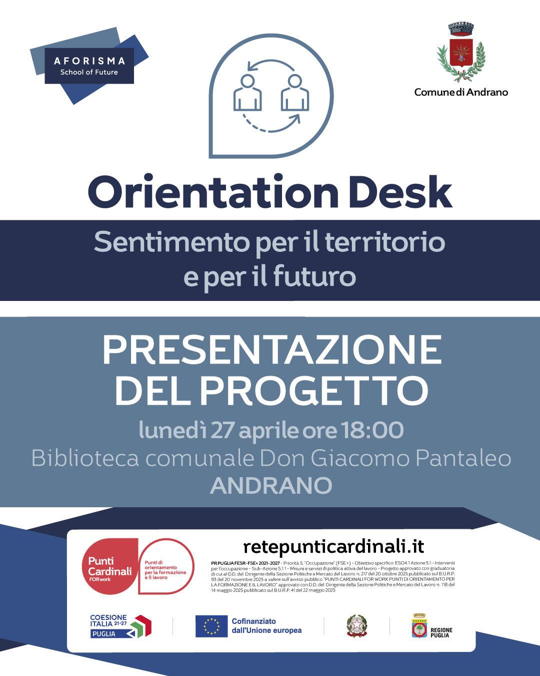 Costruiamo un sistema territoriale di orientamento che mette in rete istituzioni, imprese e comunità, con l’obiettivo di accompagnare giovani e cittadini nelle scelte formative e professionali. Il progetto favorisce inclusione, crescita delle competenze e accesso al lavoro, contribuendo allo sviluppo sociale ed economico del territorio.